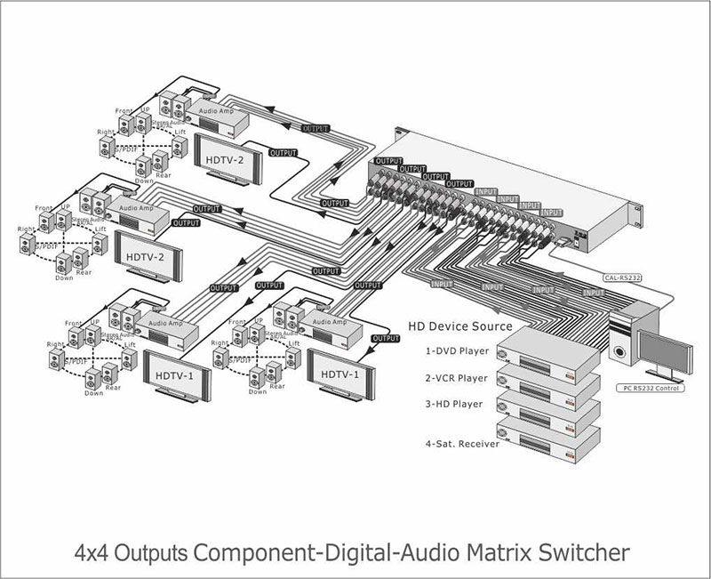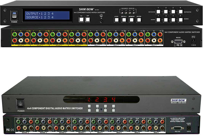 1. Support 4 inputs to 4 outputs Component-Digital-Audio Matrix Switcher 2. Support HDTV Resolution 480i, 480p, 576p, 720p, 1080i and 1080p 3. Video Bandwidth : 325MHz (-3dB), 200 mVp-p 4. Excellent Video(Component), Digital Audio and Stereo Audio Performance 5. Audio Frequency Respond : 20Hz ~ 20KHz 6. Low all hostile crosstalk of -83 dB @ 5 Mhz 7. Excellent ESD rating : exceeds 4000 V 8. Switching Component Video YPBPR, Digital Audio(PCM) and Audio signals 9. Suitable for full HD high resolution Video player device and LCD/Prasma monitor displays 10. Direct selection and confirm via Front pushbuttons with LED readout 11. Infrared : IR remote control (38KHz) 12. Support RS 232 interface control driver for 95/98/2000/xp A Windows-based control software Driver packaged 13. RS 232 protocol list with manual attached 14. Enclosure type : Support 19 inch Ear & 1RU Rack mountable pane 15. Support Lower power consumed full load under 1500 mA 16. Power supply offer a universal type 100~230 VAC switch -
