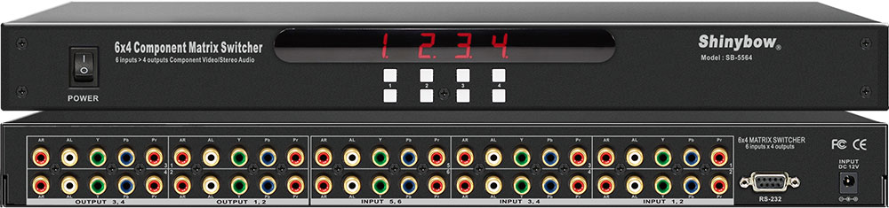 - SB-5564 is a high speed Video Bandwidth 325MHz Maximum 380MHz Matrix Router Switcher product. It’s one of the most innovative Component Video(YPbPr)and Stereo Audio(AR/AL) Switching products on the market today. Support 19 inch Ear mount pair part number #1U-440L. It has 6 individual inputs with 4 individual outputs. Because it is a matrix router, any input maybe routed to any output; or the same input may be routed to all outputs or any combination. It completely eliminates the need to constantly move around Component Video, Digital Audio and Stereo Audio input and output cables. This matrix switcher is ideally suited for full High Definition LCD HDTV TV for resolution 480p, 720p. Control is provided via front pushbuttons with LED readout or IR remote controller. A RS-232 interface is provided for interfacing with third party control. A Windows-based control software package is included to provide complete control of the SB-5564 from a PC.